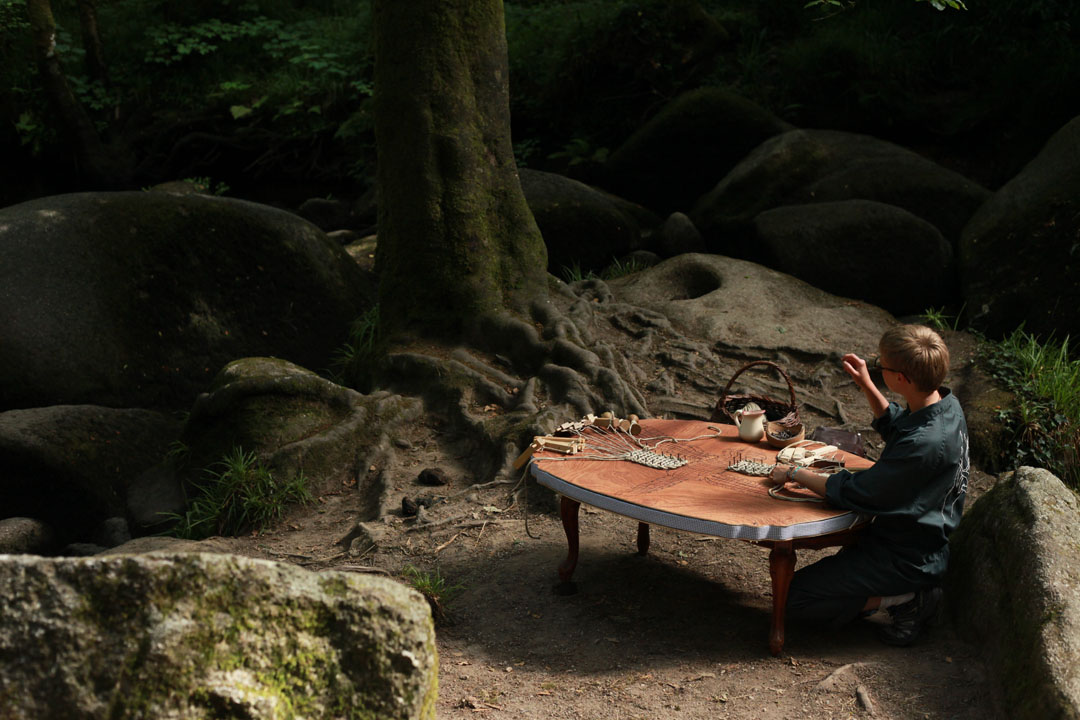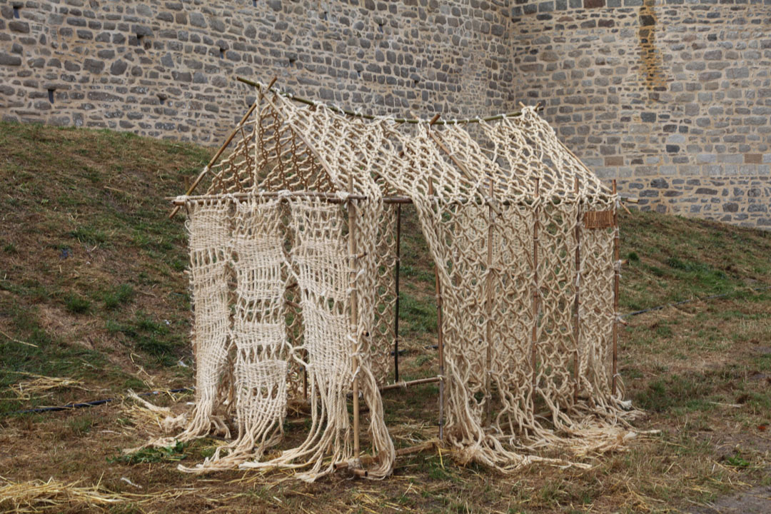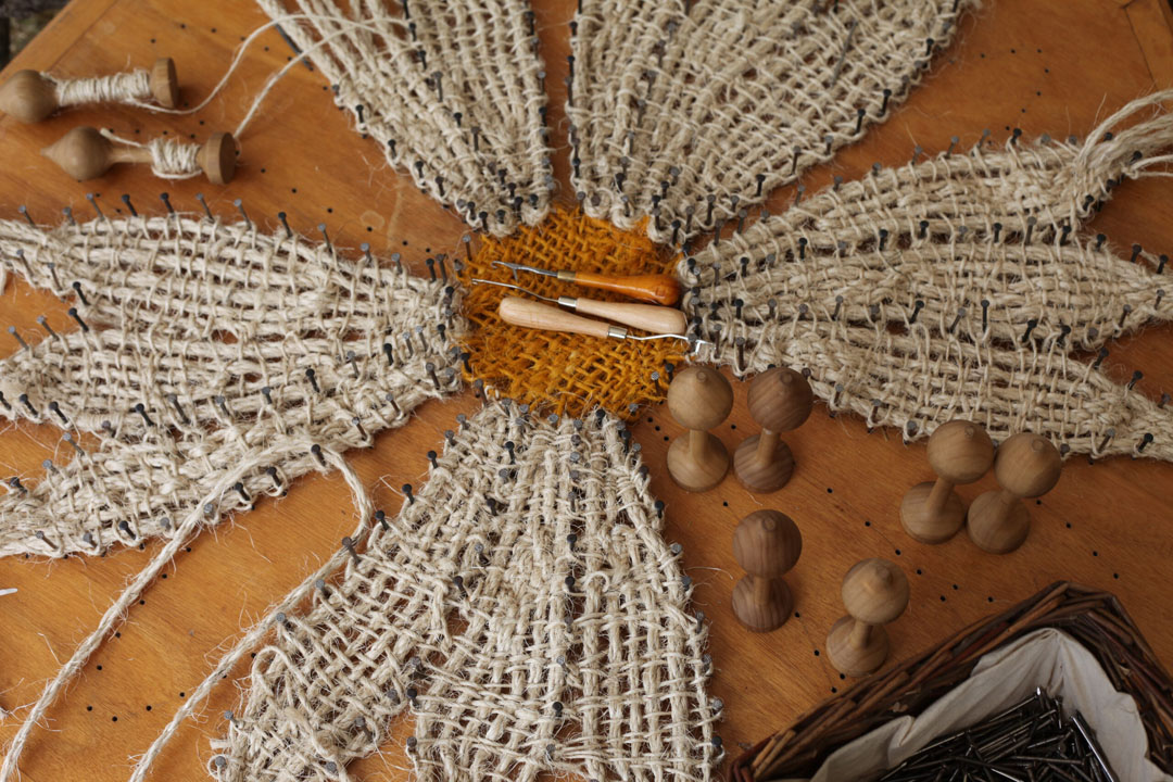 Cohérente avec sa démarche de prendre le temps de faire et de moins consommer, l’artiste construit ses propres métiers à dentelle avec des matériaux de récupération. Penser et construire son outil de travail est une manière pour elle de se le réapproprier, faisant corps avec son métier de dentelle tel une extension de ses mains.